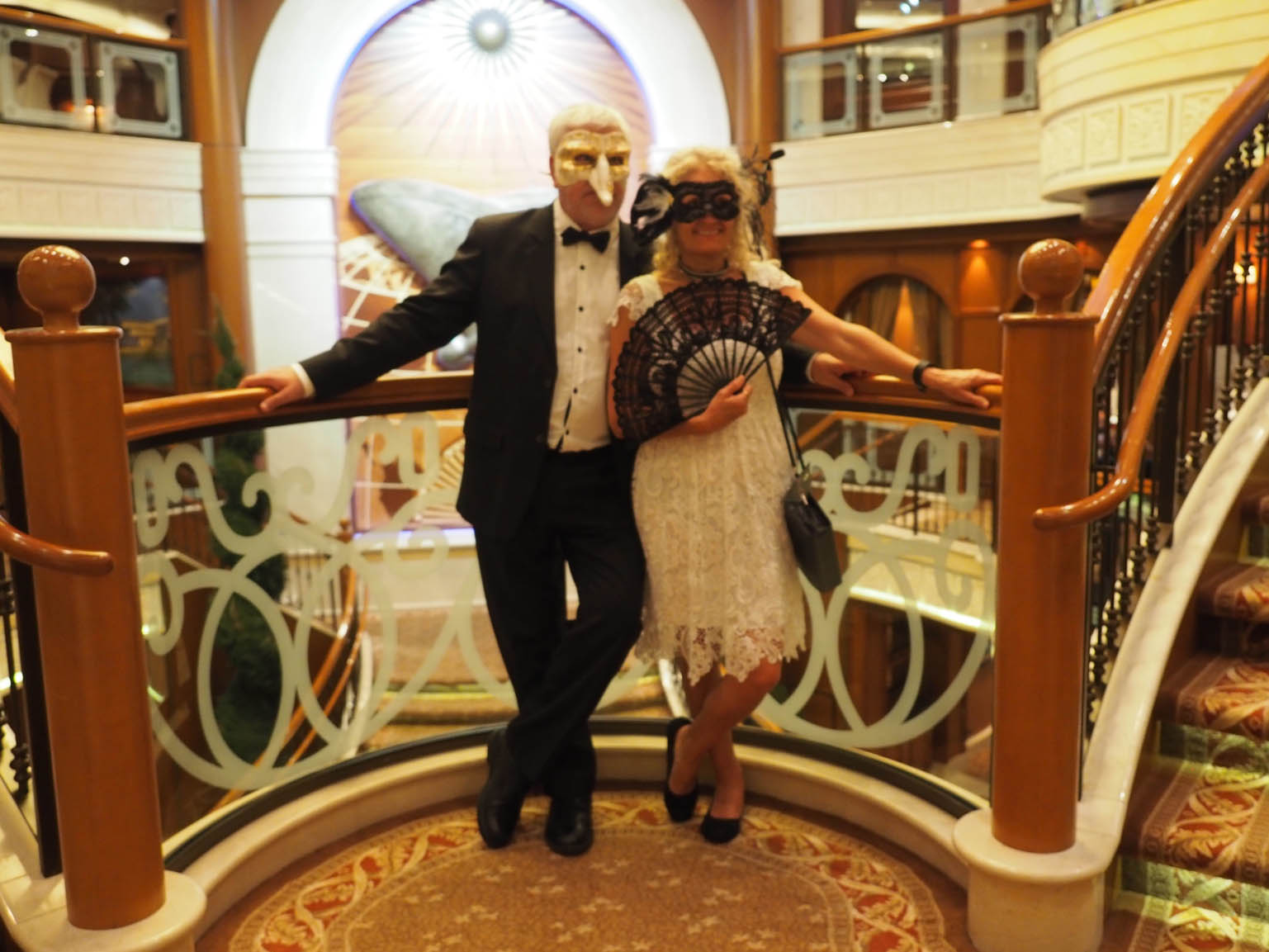 Tonight was the Venetian Ball, Di has been looking forward to this and planning for it for months. It was really good but we left it a bit late as it was after 10:30 by the time we had finished dinner. Sweat heaps behind the masks as well but my mask with the big nose was a big hit, now I don’t want to have any comments saying “what mask?”.